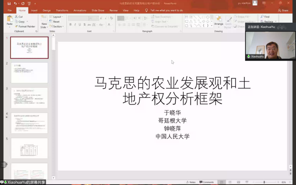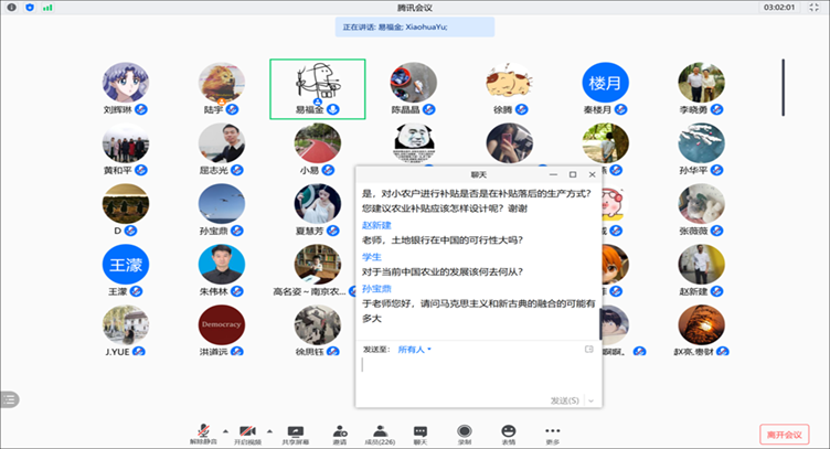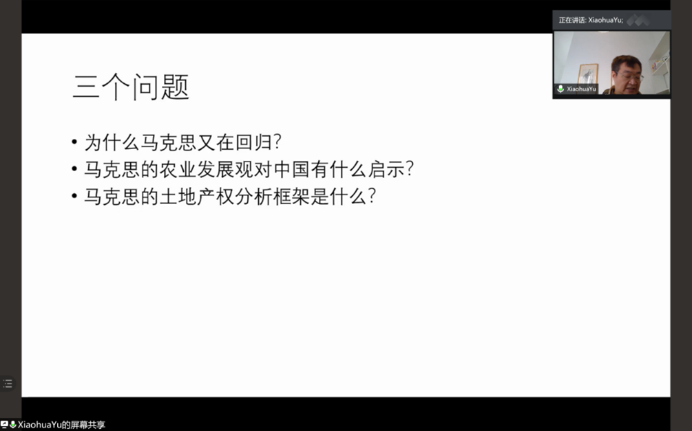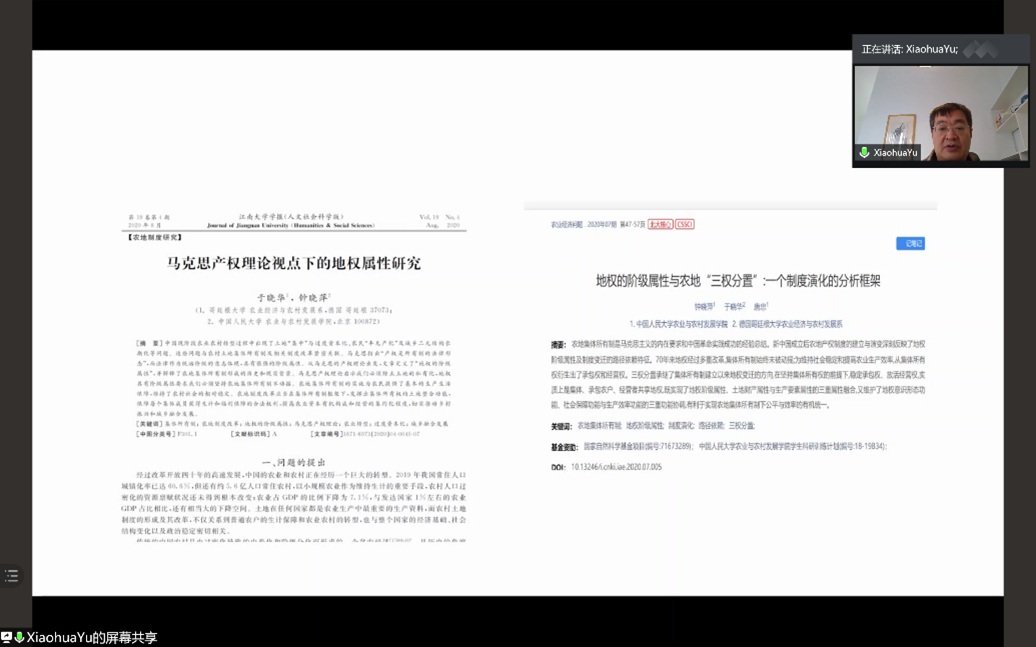 报告结束后,于晓华教授就马克思主义的新古典经济的融合、土地“三权分立”等问题与大家进行了进一步讨论,线上会议讨论气氛热烈。