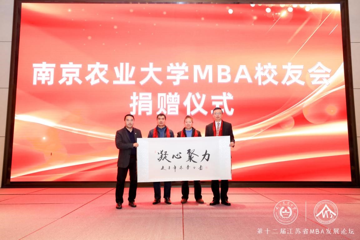 会上,江苏省MBA企业家联谊会向beat365正版唯一官方网站MBA校友会赠送了“凝心聚力”四个字的温情卷轴。校友总会秘书长张红生,beat365正版唯一官方网站副院长耿献辉,MBA校友会会长刘兴龙接受礼物。