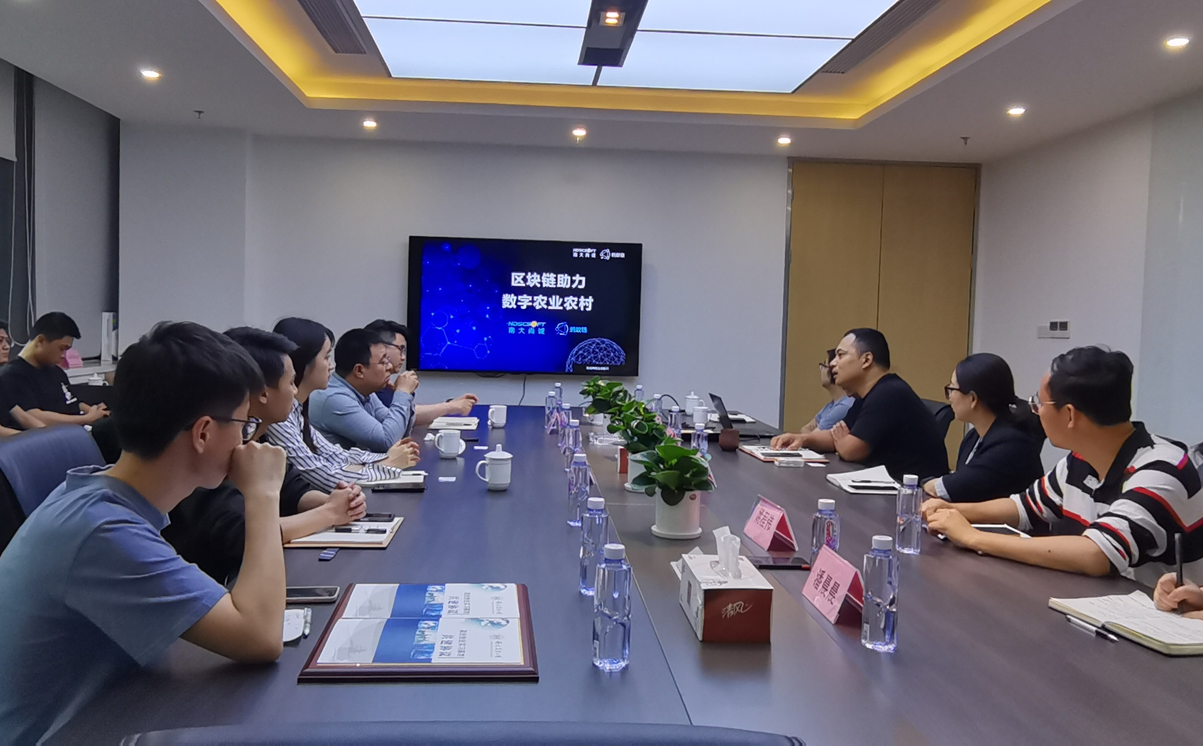 宋俊峰一行与南大尚诚软件科技有限公司董事长王晟松及相关负责人座谈,听取公司发展概况及主要业务介绍,双方就产学研融合、学生实习实践等校企深度合作事宜展开探讨。