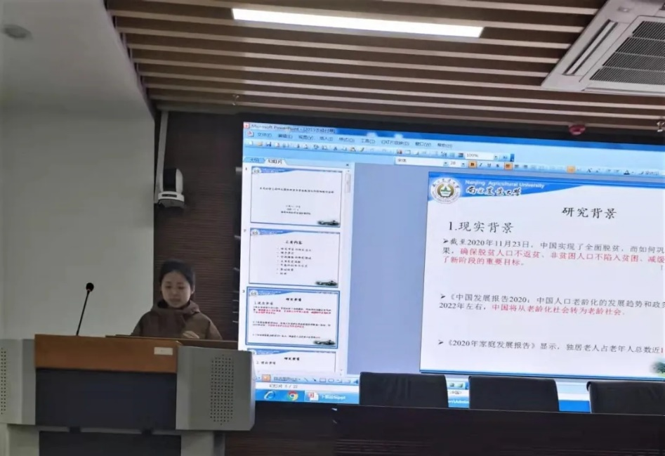 付翠同学汇报的是《正式社会支持对我国农村老年家庭脆弱性的影响路径分析》文章利用中国家庭追踪调查(CFPS)数据,研究正式社会支持对老年家庭脆弱性影响及影响路径。研究发现:①较高水平的养老保障会显著降低老年家庭脆弱性,而医疗保障对老年家庭脆弱性的影响不显著;②正式社会支持通过提高家庭风险抵御能力与增强非正式社会支持对老年家庭脆弱性的作用,进而降低老年家庭脆弱性。