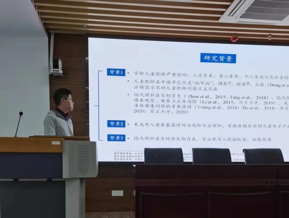 张赟同学汇报的是《隔代照料、屏幕暴露与农村学龄儿童肥胖》。文章以儿童屏幕暴露作为研究隔代照料对学龄儿童肥胖机制影响的新视角,综合使用CFPS与CHNS数据库,研究验证了隔代照料对儿童屏幕暴露的危害,并讨论了其中的性别异质性。此外,构建中介效应模型检验了屏幕暴露对儿童肥胖的直接与间接路径。