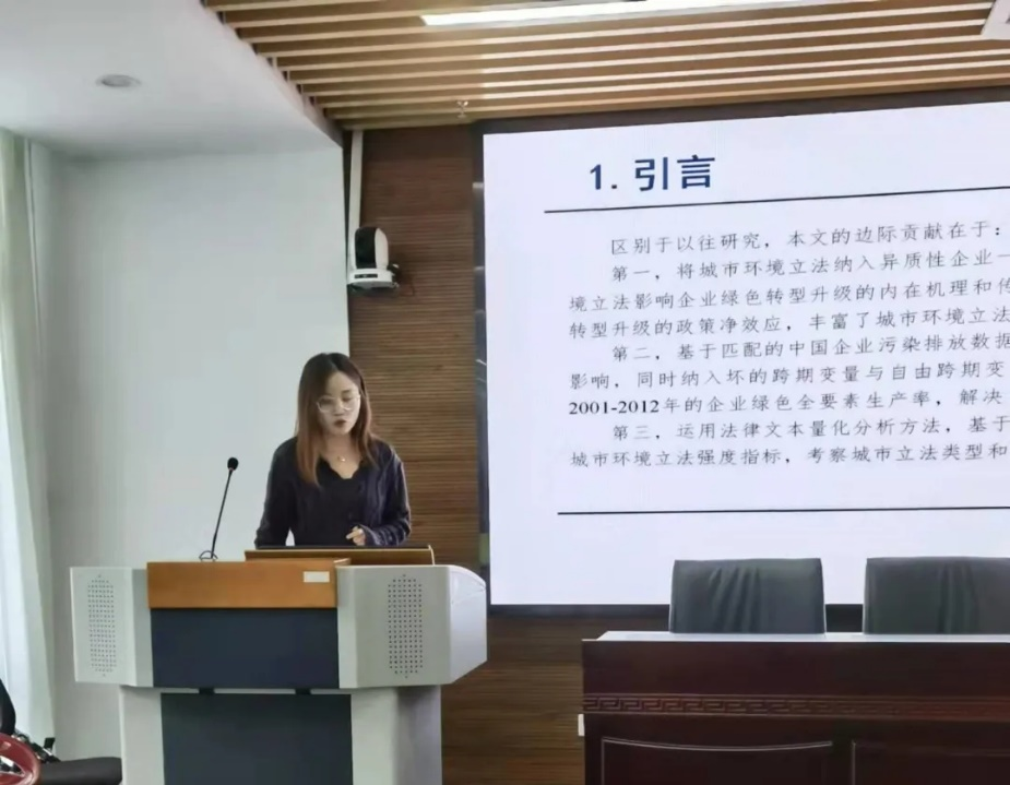余澜同学汇报的是《城市环境立法如何引导企业绿色转型?——基于企业绿色全要素生产率视角》。文章以松弛向量度量的DSBM模型测算得到的企业绿色全要素生产率作为衡量企业绿色转型的代理变量。以城市环境立法为准自然实验,将其纳入异质性企业一般均衡分析框架,揭示了其影响企业GTFP的内在机理。同时进行倾向得分匹配、安慰剂检验、考虑内生性及排除其它政策干扰等稳健性检验,在企业、行业、城市层面以及针对不同环境立法类型与立法强度展开异质性分析。