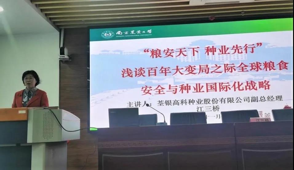 11月12日下午,安徽荃银高科种业股份有限公司副总经理江三桥、总经理助理兼人力资源总监王自生等一行四人访问我校。江三桥副总经理在第三实验楼706为beat365正版唯一官方网站70余名师生做了题为“粮安天下 种业先行—全球粮食安全与种业国际化战略”的报告分享会。国际教育学院院长韩纪琴教授主持报告会。