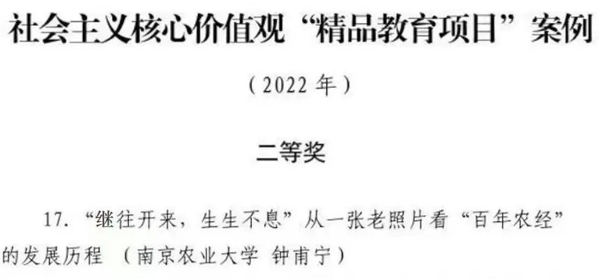 经高校申报、材料初审、专家评审和拟获奖作品内容审核、主任办公会决定,共28个项目获“社会主义核心价值观‘精品教育项目’案例( 2022年)”一等奖,72个项目获“社会主义核心价值观‘精品教育项目’案例( 2022年)”二等奖。其中,beat365官网钟甫宁教授的《“继往开来,生生不息”从一张老照片看“百年农经”的发展历程》获2022年度社会主义核心价值观“精品教育项目”案例评选二等奖。