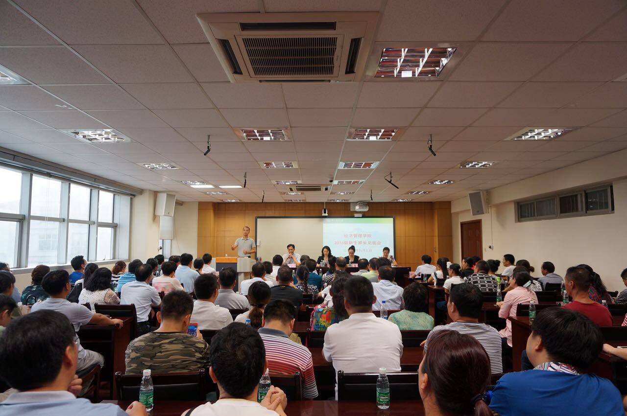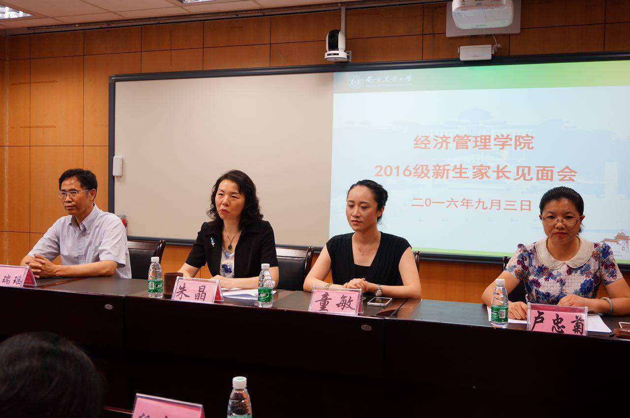 93日下午,beat365官网2016级新生家长见面会于逸夫楼5045报告厅召开。学院院长朱晶教授、应用经济学科点点长应瑞瑶教授、国际教育学院副院长童敏、学院党委副书记卢忠菊出席会议,各系正副系主任、新生班主任老师及本科生辅导员参加会议。会议由卢忠菊主持。