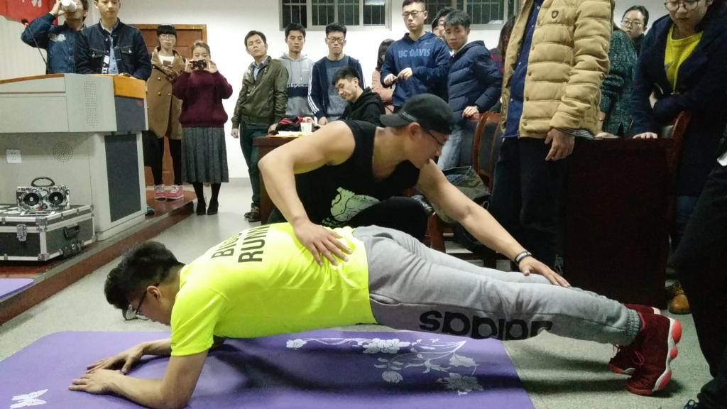 林枫老师先是进行了简单的自我介绍,用几段精彩的力量展示调动了现场的气氛。随后林老师讲解了人体各个部位肌肉组成,对各个肌肉群体的用途做了详细的说明。然后亲自示范了各个部位的肌肉应该怎样锻炼,主要针对二头肌、三头肌、胸肌、背阔肌、竖直肌等,中间还邀请同学们上台进行互动,现场气氛十分活跃,同学们参与的热情很高。