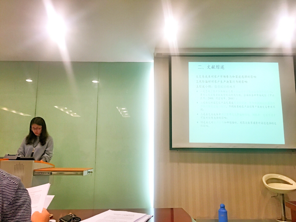 此外,王许沁同学做了题目为《农机购置补贴政策:效果与效率》的汇报,谭鑫同学做了题目为《农民合作社核心成员社会资本与政策资源获取及内部成员受益差异研究》的汇报,李美佳同学做了题目为《外商直接投资独资化挤出国内投资吗?—基于工业行业要素密集度异质性的视角》的汇报,顾天竹同学做了题目为《美貌溢价:歧视是主因么?—基于中国劳动力动态调查数据的实证研究》的汇报,毛慧同学做了题目为《契约农业视角下的农户技术采纳决策—基于江苏省345个农户微观调查数据》的汇报。