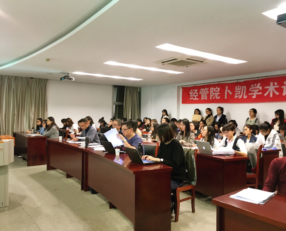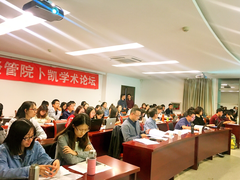 2017年10月18日晚6点30分,经管院研会学术部举办的第八十五期卜凯论坛在逸夫楼5086成功举办,仲漫、王许沁、谭鑫、李美佳、方萍萍、顾天竹、毛慧、翟乾乾、吕沙做了精彩的汇报,何军、朱战国、田曦老师给予了详细的点评。