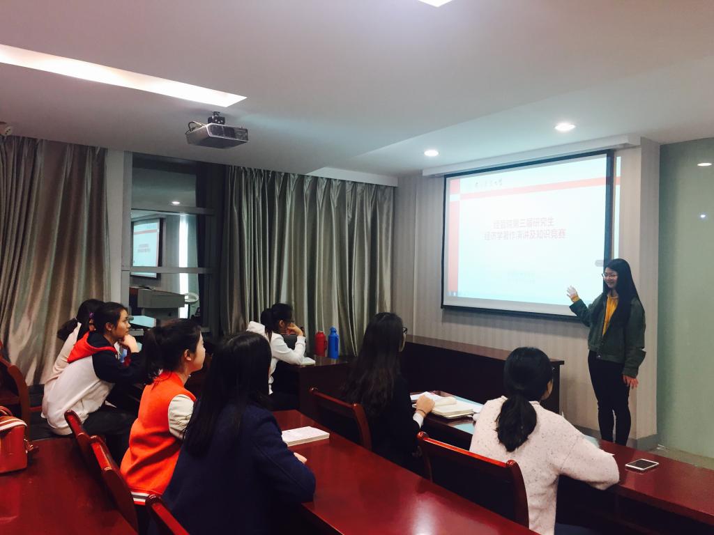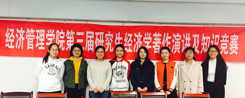 2017年11月14日18点30分,经管院研究生会在逸夫楼5086成功举办“经济学著作演讲及知识竞赛”活动。比赛由主题演讲、即兴演讲和经济学知识问答三环节组成,张彤、徐乔、石颖、俞文静四位同学参加,经管院主席团担任评委。