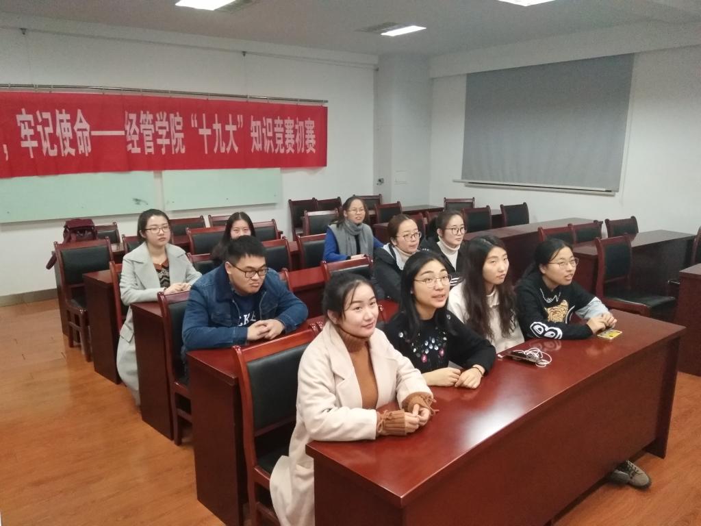 2017年12月2日下午6点,经管院研会党建班成功举办“不忘初心、牢记使命——学习党的十九大精神”知识竞赛初赛。本次比赛设置必答和抢答两个环节,陈杰、张彤、丁瑶、颜明珠、白馨五位同学参加。