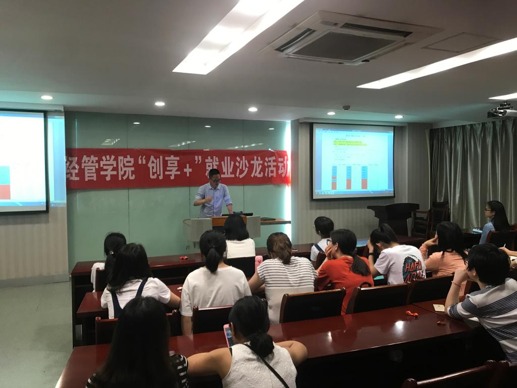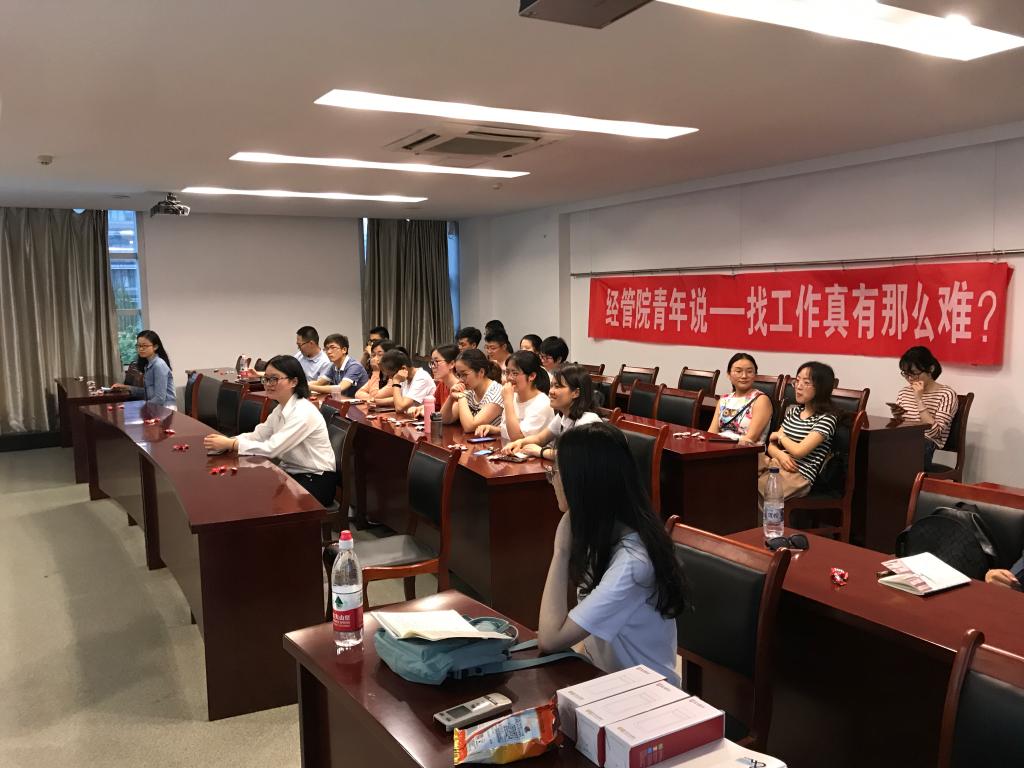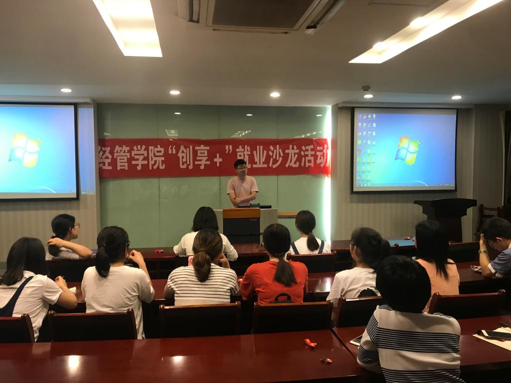 2018年5月15日晚上6点30分,在逸夫楼5086教室经管院研究生举办“创享+”就业沙龙活动,邀请到三位优秀的研三同学——徐慧君、李子键、佘正昊,结合自身学习、求职、就业经历和同学们进行了深入交流。