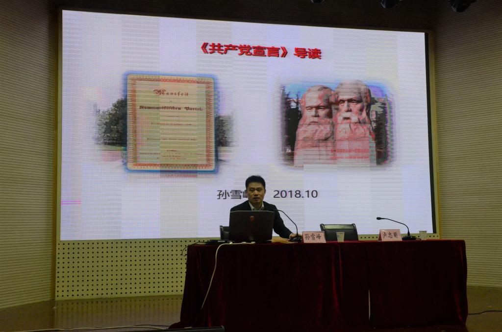 孙雪峰以“《共产党宣言》导论”为主题作报告。他对《共产党宣言》诞生的历史背景、形成过程、内容以及当代价值进行了详细解读。他通过国家版图变迁、世界城市发展变迁、共产党宣言的基本原理以及新中国领导人对宣言的态度等内容,向同学们详细介绍了共产党宣言的时代意义和现实价值。他要求同学们深刻思考“今天怎么阅读《共产党宣言》和坚定共产主义信仰的价值”等问题,鼓励同学们理解并时刻铭记宣言的性质、内容,将宣言内容内化于心,外化于行,不断提高自身党性修养,早日成为一名合格的共产党员。