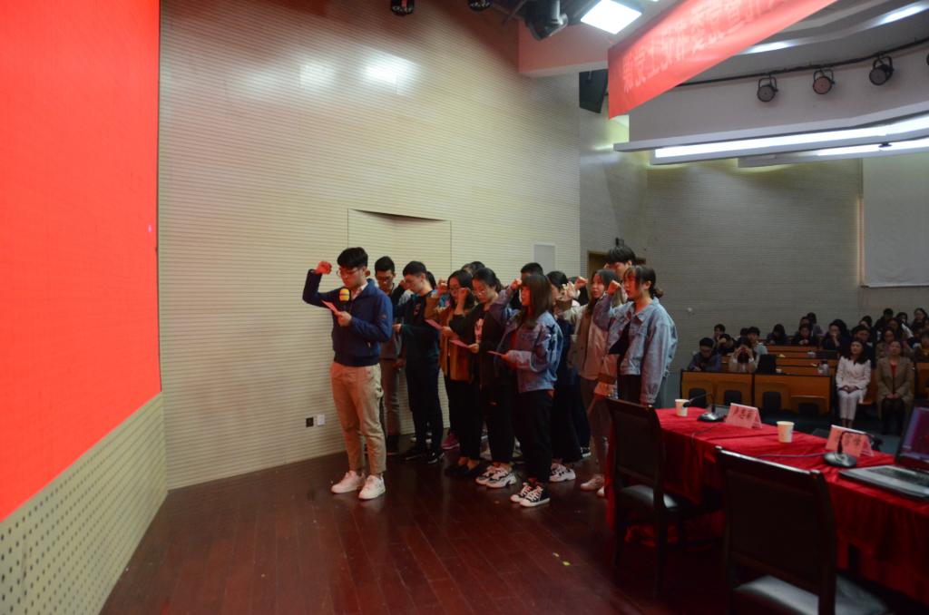 专题党课结束后,新发展党员在本科生党员代表严泽轩同学的带领下,在党旗下庄严进行入党宣誓。