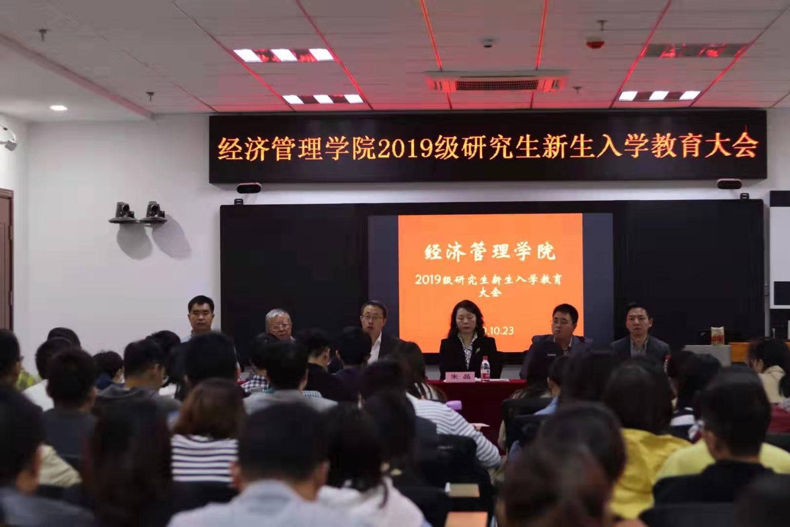 2019年10月23日晚上,beat365官网2019级研究生入学教育大会在第三实验楼821举行。学院党委书记姜海教授、院长朱晶教授、校学术委员会副主任钟甫宁教授、院党委副书记宋俊峰、副院长耿献辉教授、副院长林光华教授及研究生辅导员张杨出席了本次大会,全院140多名2019级研究生新生到场聆听。大会由宋俊峰副书记主持。