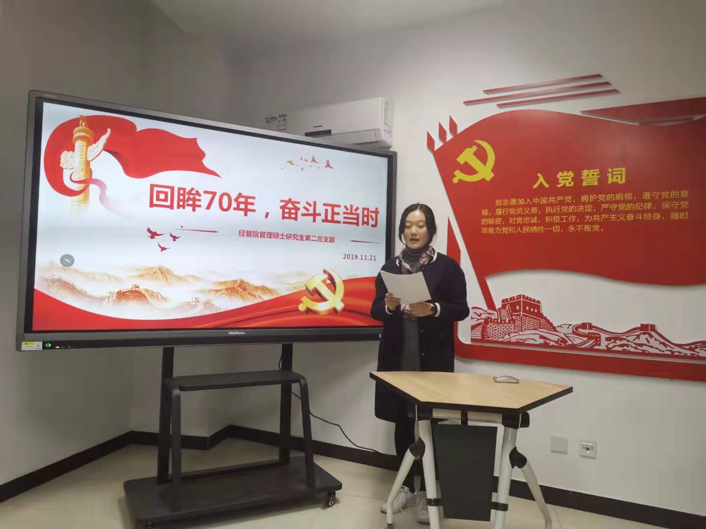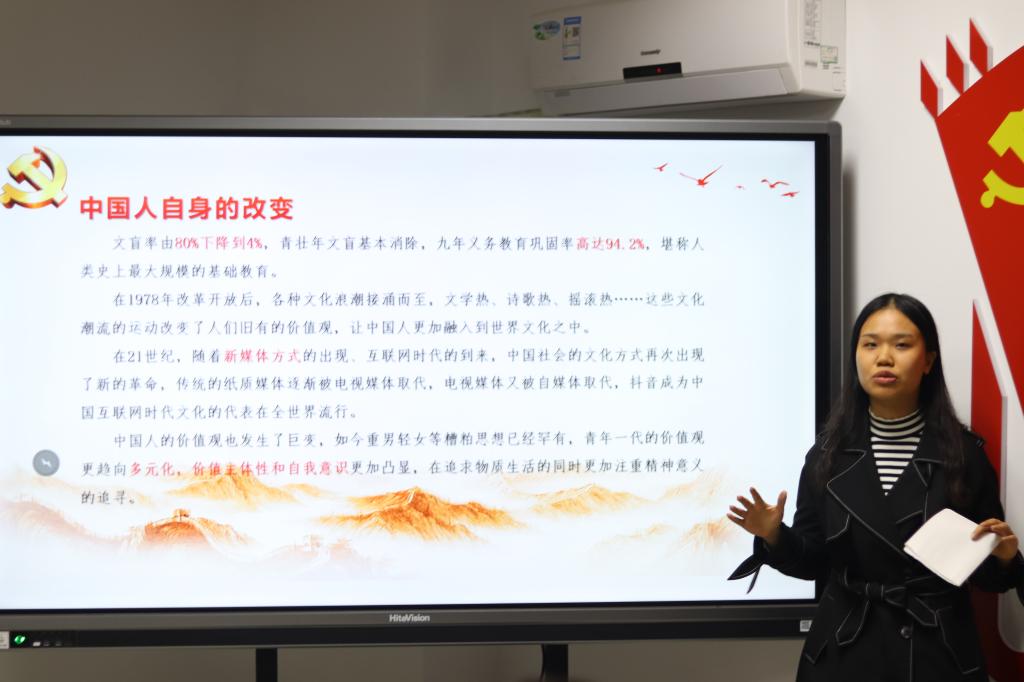 博士生、硕士生共七个党支部围绕人工智能与数字经济、建国70周年的沧桑巨变、乡村振兴与脱贫攻坚等三大主题展开讲解,各党支部材料准备充分,主讲人精神状态饱满,语言表现充足,讲课内容丰富、形式多样、效果良好。由19博士支部党支部书记章丹同学带来的《不忘初心,数字中国》的演讲展示,向大家讲述了数字经济的概念及发展现状,并引例“华为事件”论述科技创新的重要性,只有科技强国才能兴国。熊紫龙等三名同学代表19专硕党支部分别从数字经济下的“双十一”、人工智能与教育、数字经济助力乡村振兴等三个角度进行了讲述。关于建国70周年的沧桑巨变这一主题,19管理硕士支部从政治、经济、社会、科技等各方面让同学们感受到了70年来的巨大变化,并通过视频的方式展示了支部党员为实现伟大复兴中国梦而努力奋斗的决心,赢得一片掌声。余澜作为19经济硕士党支部书记代表本支部数说了辉煌70载的中国制造成就,并讲述了从中国制造到中国创造、中国智造的重大意义,中国在不断创新、不断强大,更激励我们青年人不断奋斗。18级经济硕士支部的党课讲解更加聚焦,重点阐述了70年来我国农业政策的演变与发展。18管理硕士党支部向观众们展示了党的十八大以来我国整体脱贫的成绩,贫困人口大幅减少,成效显著;18博士党支部带来《三力三生促振兴,产城人文谱新章----从沙集模式到睢宁经验》这一作品,由乡村振兴战略理论到具体的沙集案例,为观众留下了深刻的印象。