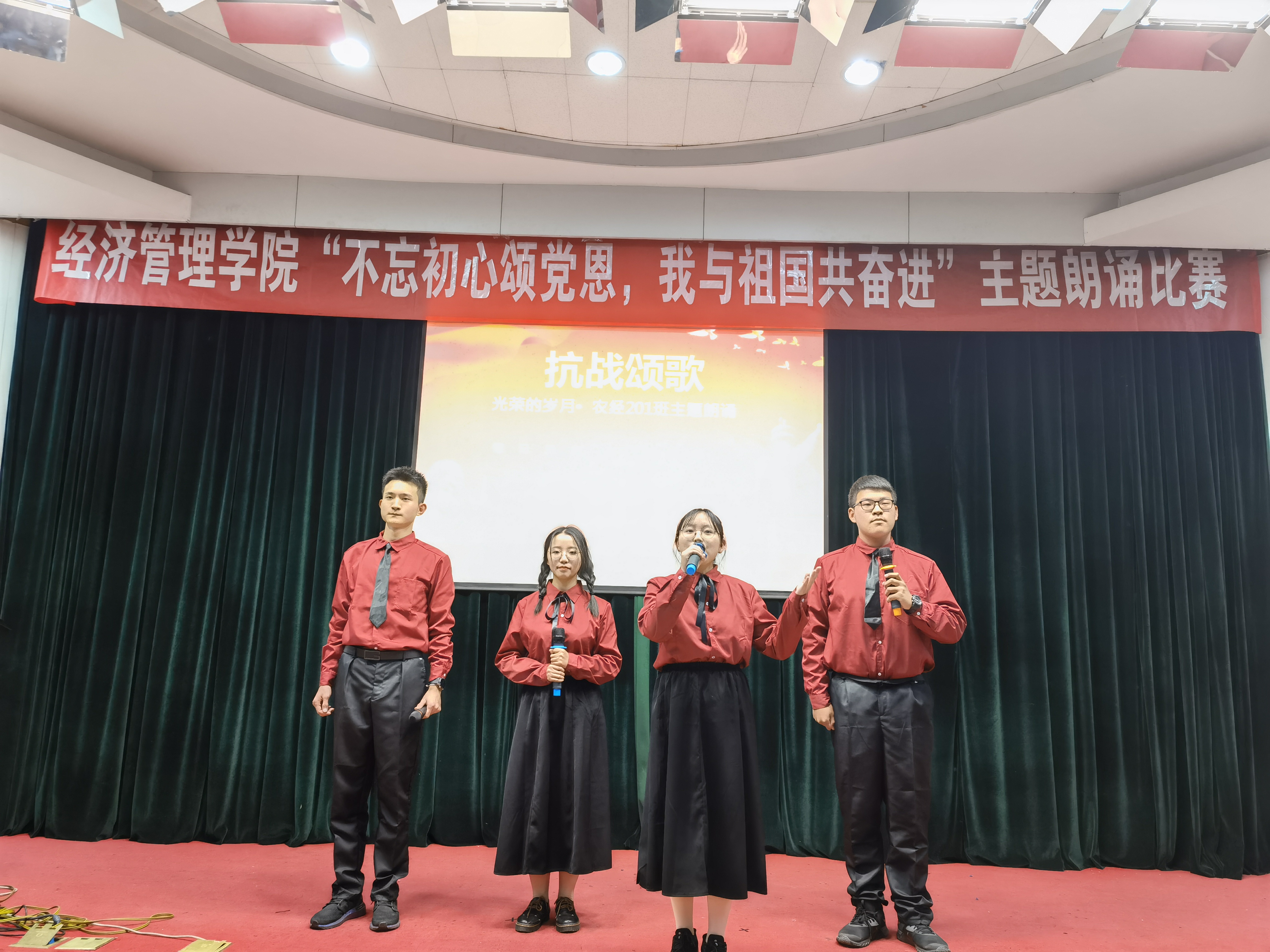 农经201班带来的朗诵《抗战颂歌》让我们看到了在八十多年前的中国在无数百姓流离失所危难之际,中国人民仍然在战火中发出了生命的呐喊;