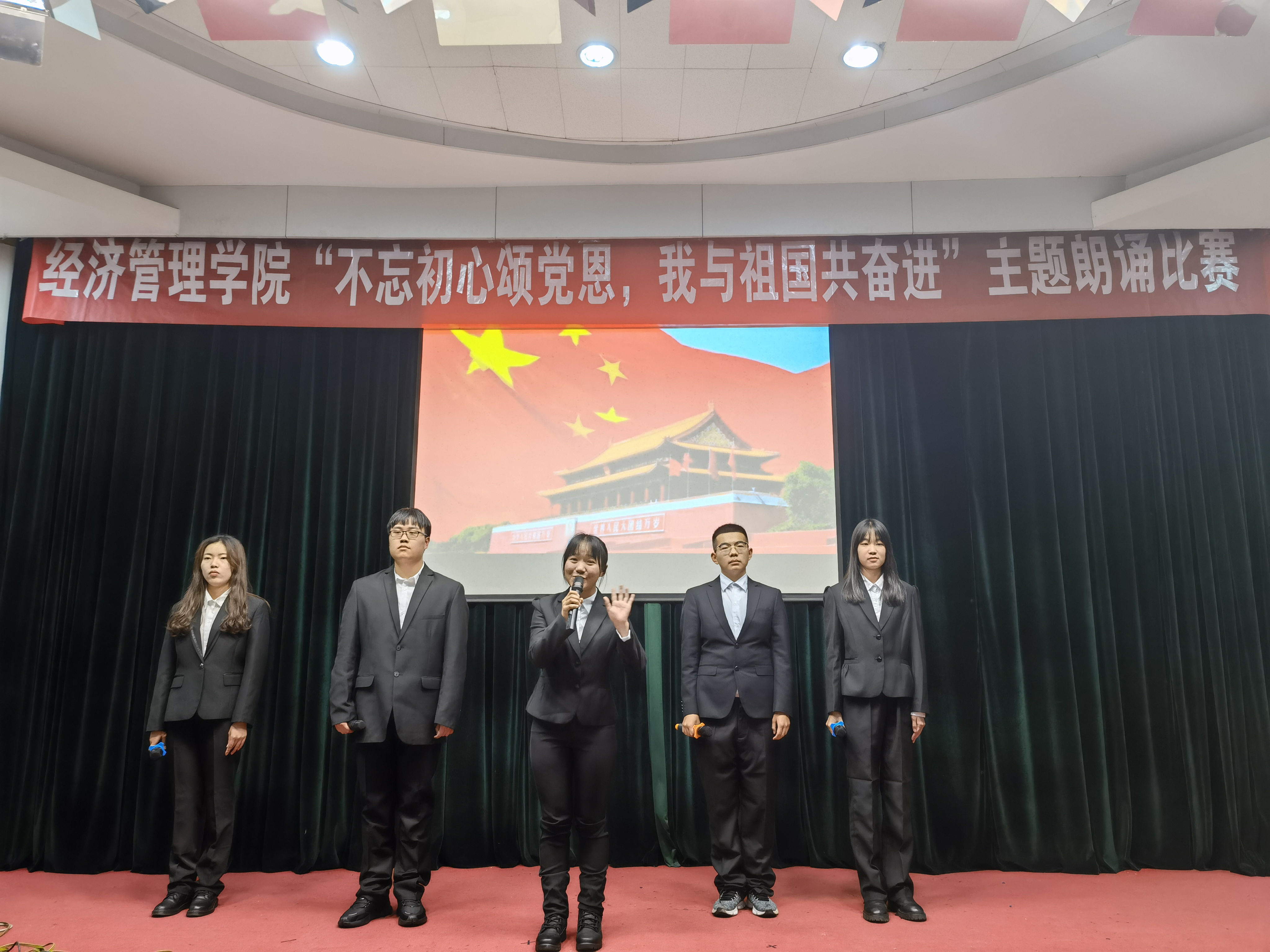 国贸201班带来的朗诵《千年伟业,百年恰是风华正茂》激励我们吾辈正值风华正茂,定当不忘初心,不负党恩,与国奋进;
