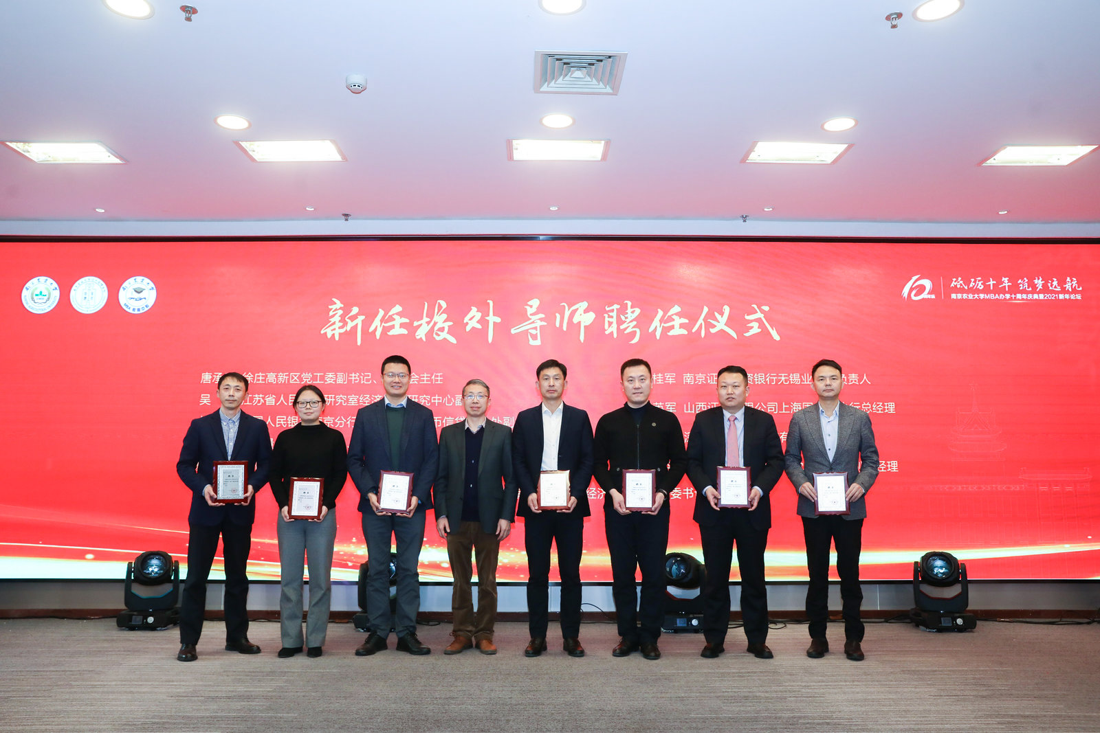 会上举行了MBA新任校外导师聘任仪式,徐庄高新区管委会主任唐承武,江苏省人民政府研究室经济研究中心副主任吴江,人行南京分行货币信贷统计处副处长林琳,明特量化董事长赵亮,杭州银行南京分行营业部副总经理戴润静,南京证券投资银行无锡业务部负责人程桂军,山西证券上海固收部执行总经理付英军,深圳汇融数字科技有限公司首席执行官曾再兴,中华财险江苏分公司党委委员、副总经理顾祖平等9位高管受聘为我校MBA校外导师,姜海书记为新任校外导师颁发聘书。