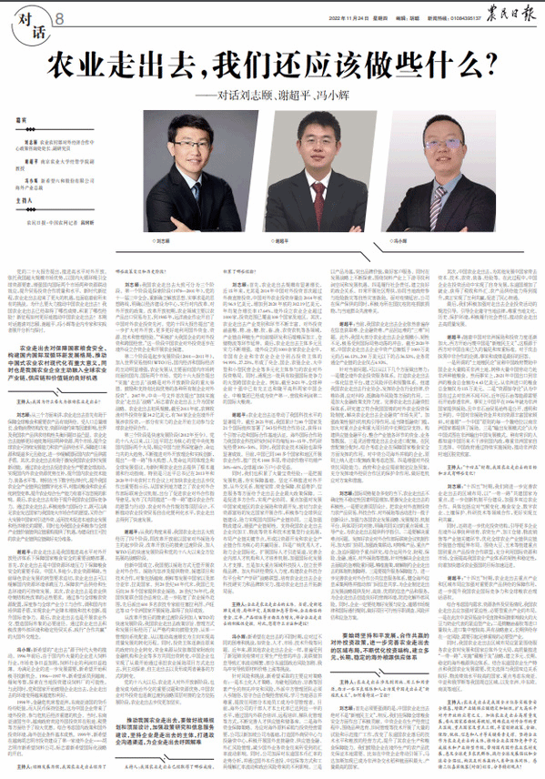 谢超平:农业走出去是我国推进高水平对外开放经济体系下保障国家粮食安全的重要战略部署。首先,农业走出去是中国资源环境压力下保障粮食安全的重要手段。中国人多地少,农业资源稀缺,当前绿色农业发展的转型要求迫切,农业走出去可以缓解国内资源环境承载压力,保障农产品供给和生态环境的可持续发展。其次,农业走出去是农业供给侧结构性改革的必然要求。通过参与全球粮农资源配置,深度参与全球产业分工与合作,调和国内市场供需矛盾,实现农业产业降本增效和技术创新,提升国际竞争力。最后,农业走出去也是开展农业外交、塑造国际形象的必要途径。通过农业走出去积极改善外部环境和稳定经贸关系,践行“合作共赢”的大国外交理念。